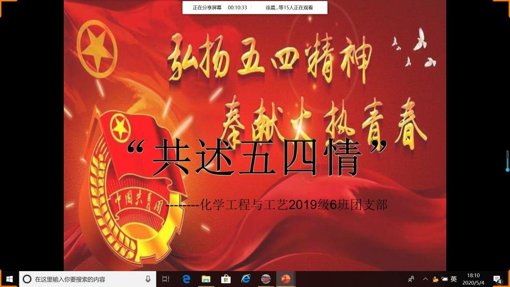 5月4日,化工196班在线上开展“弘扬五四精神,奉献大爱青春”主题团日活动。本次活动由班长李永庆与团支书宋文杰组织,全班27名同学参加了本次活动。