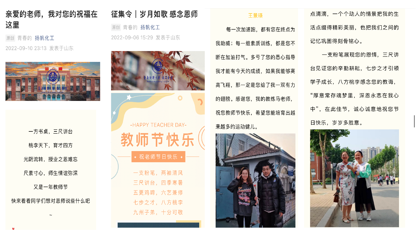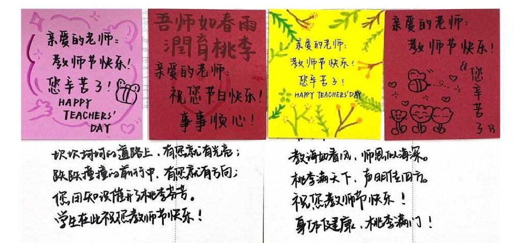 营氛围,谢师恩。公司以视频诉说师生情谊,用笔杆写下温暖祝福。员工拍摄视频表达对老师们的崇高的感谢与真挚的祝福,送上贺卡感恩老师们的辛勤付出。公司还推出教师节祝福征集活动,以多样的角度记录老师朴实无华的教诲和日夜不休的陪伴,创作出一篇篇情真意切、温暖人心的作品,将老师们的辛苦付出跃然纸上,将员工们的祝福传递给老师。